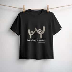 Ein weißes T-Shirt mit einer markanten, minimalistischen Grafik von zwei grünen Figuren und der Botschaft „EveryBody is…