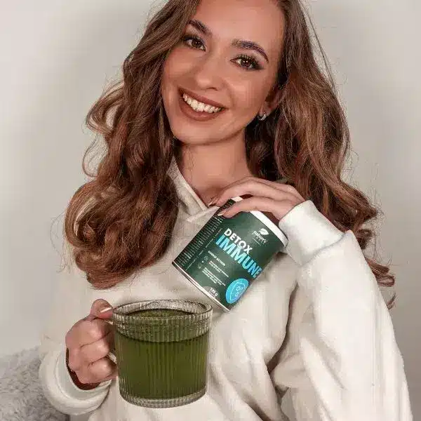 Mischen Sie 1 Messlöffel (5 g) des Produkts Detox Immune in ein Glas Wasser (200 mL) und trinken Sie es.