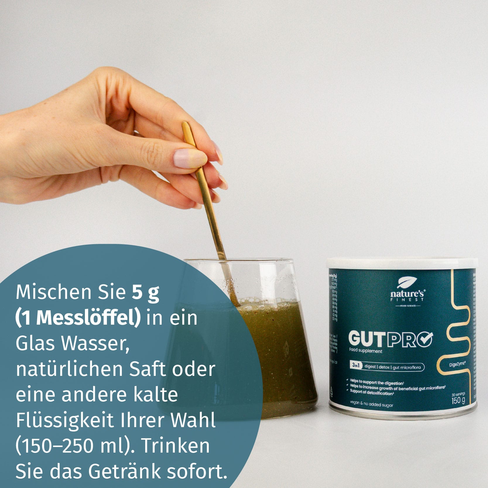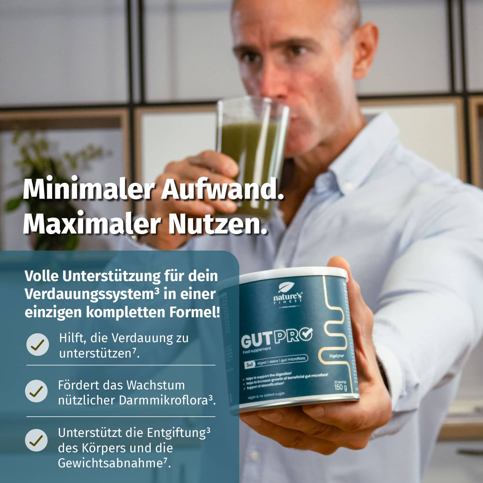 GutPRO ist keine schnelle Übergangslösung, sondern eine hochwertige Formel für nachhaltige Ergebnisse. Es vereint Unterstützung für Verdauung⁷, Entgiftung³ und Darmflora³ in einer einfach anzuwendenden Formel – so können Sie mühelos konsequent bleiben.