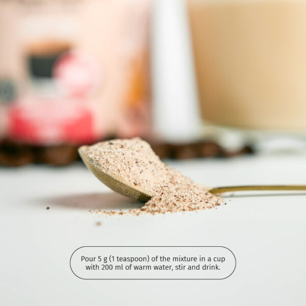 5 g (1 Teelöffel) der Mischung in einer Tasse mit 200 ml warmes Wasser übergießen, umrühren und trinken.