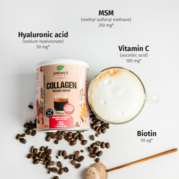 Zutaten: Kollagenpulver, Instantkaffee, Tapiokastärke, MSM (Methylsulfonylmethan), Vitamin C (Ascorbinsäure), Stabilisator: Cellulose, Hyaluronsäure, D-Biotin.