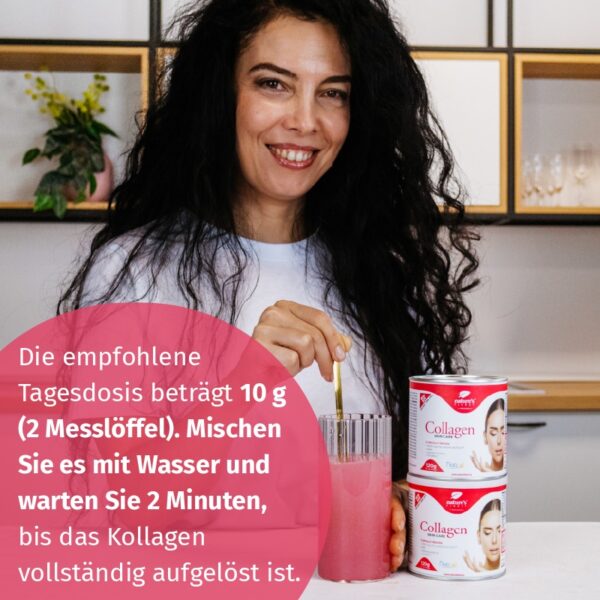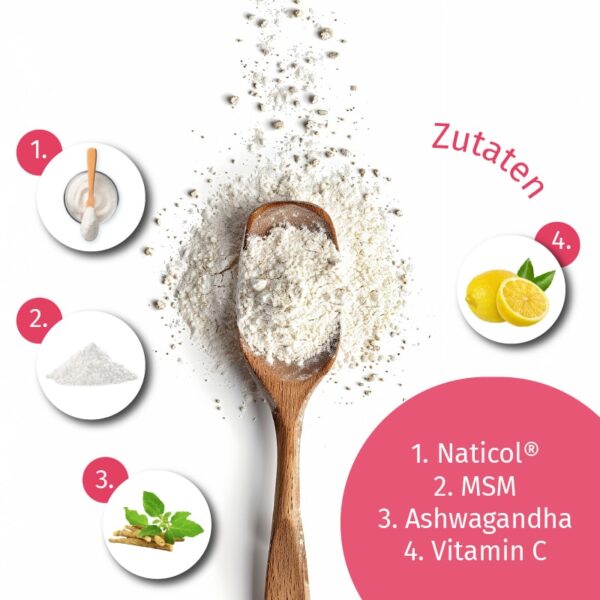 Die empfohlene Tagesdosis beträgt 10 g (2 Messlöffel). Mischen Sie es mit Wasser und warten Sie 2 Minuten, bis das Kollagen vollständig aufgelöst ist. Mit 10 g Pulver nehmen Sie 5 g Naticol Kollagenpeptide zu sich.