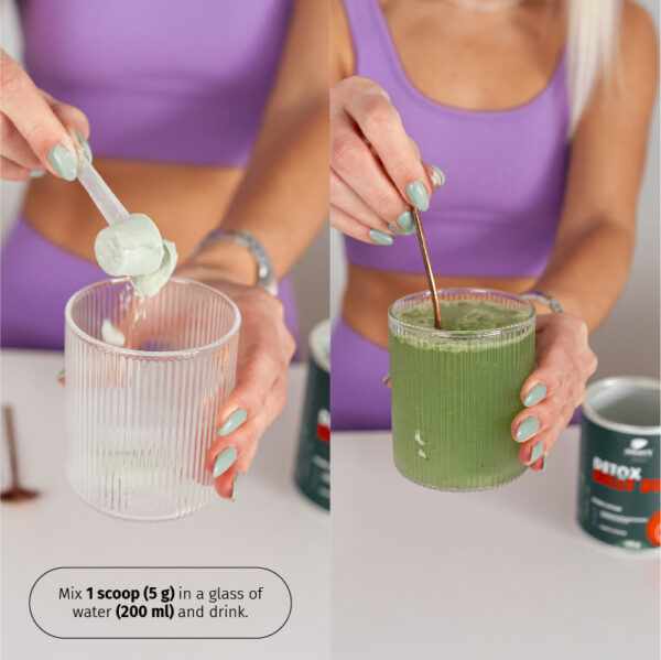 Detox Belly Burn: Mischen Sie 1 Messlöffel (5 g) in einem Glas Wasser (200 mL) und trinken Sie es.